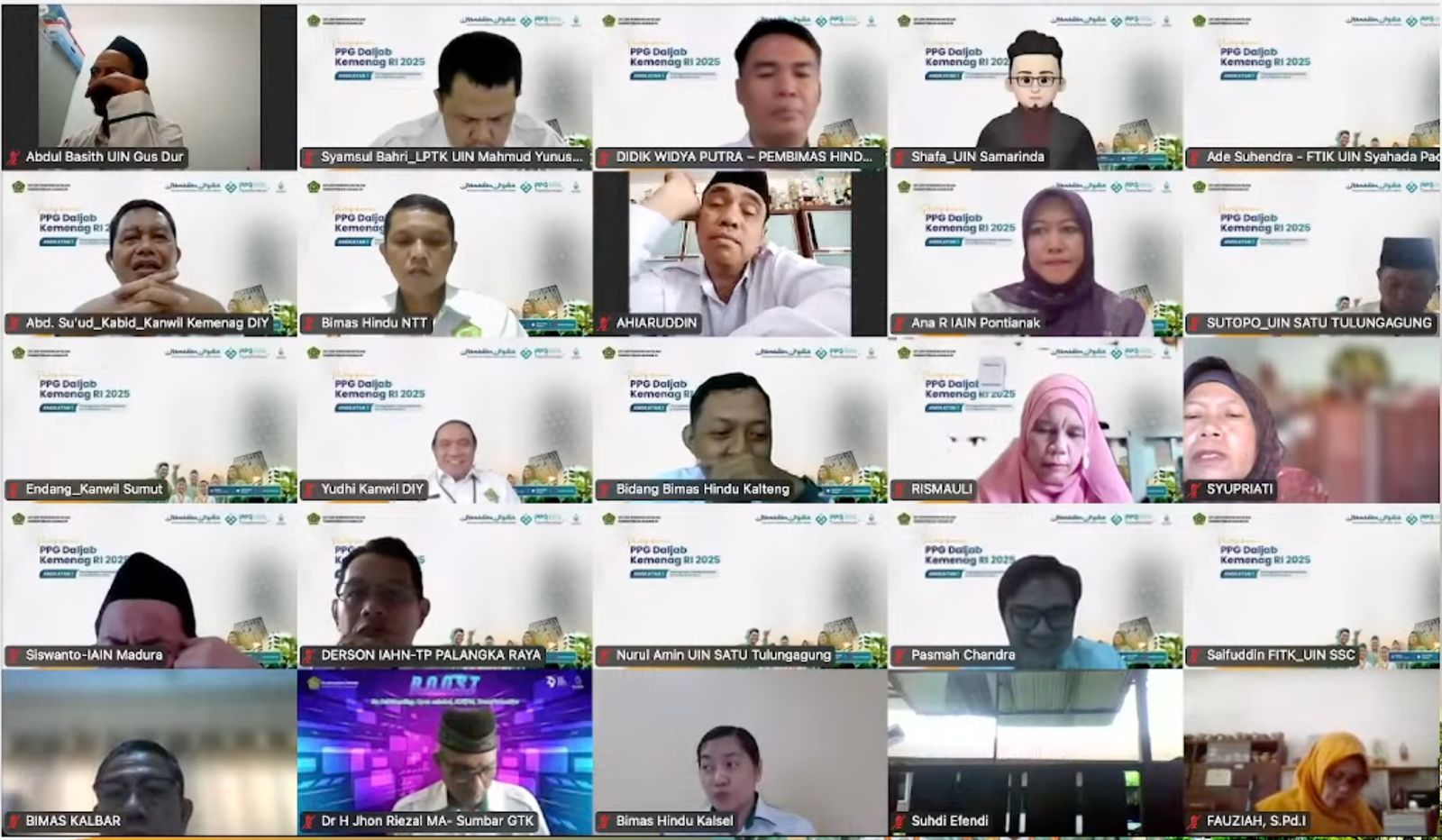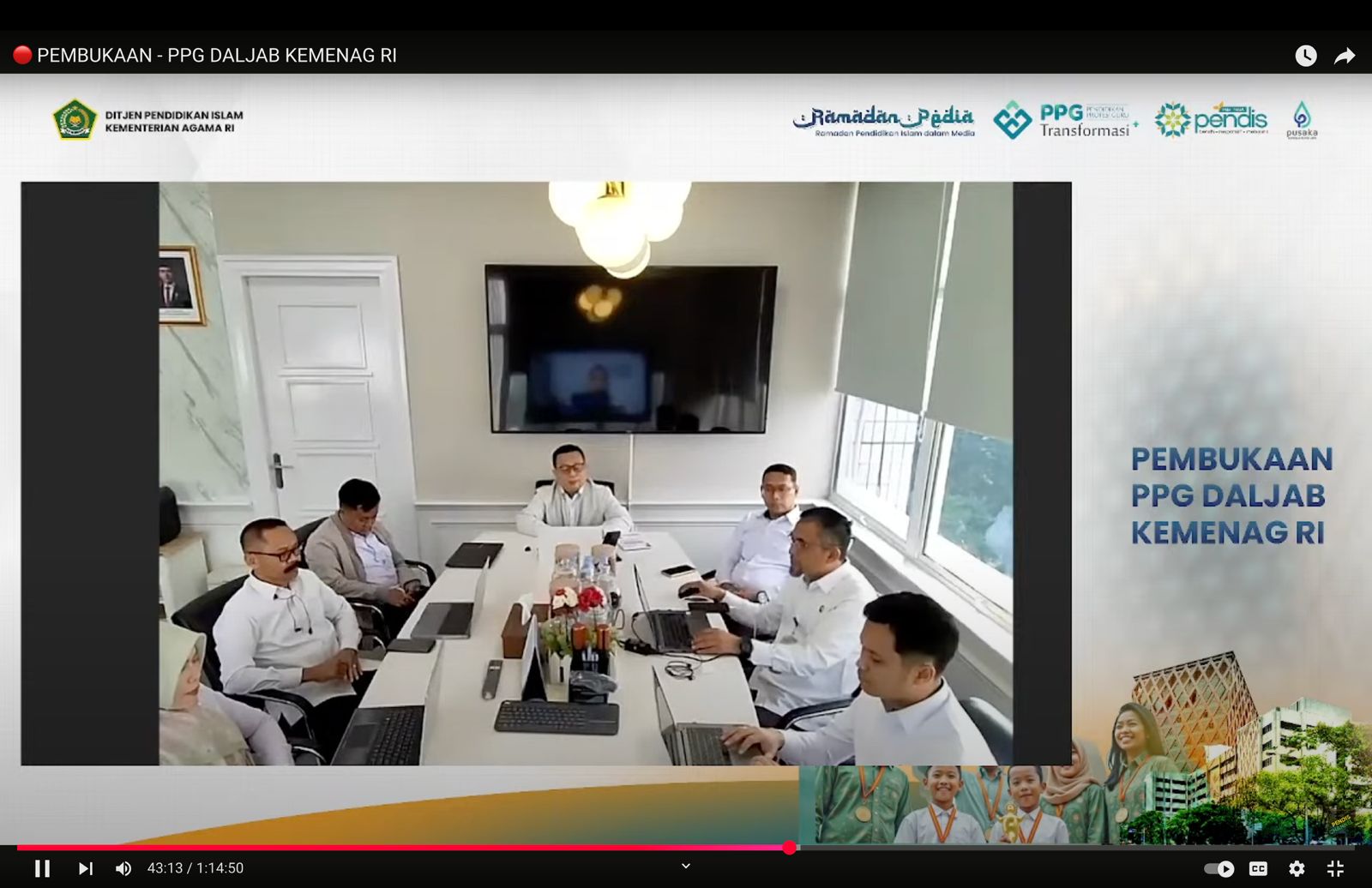 Pembukaan PPG Daljab Angkatan I ini digelar secara daring. Sebagian peserta mengikuti melalui aplikasi zoom, sebagian lainnya menyaksikan melalui live streaming channel youtube Kementerian Agama.