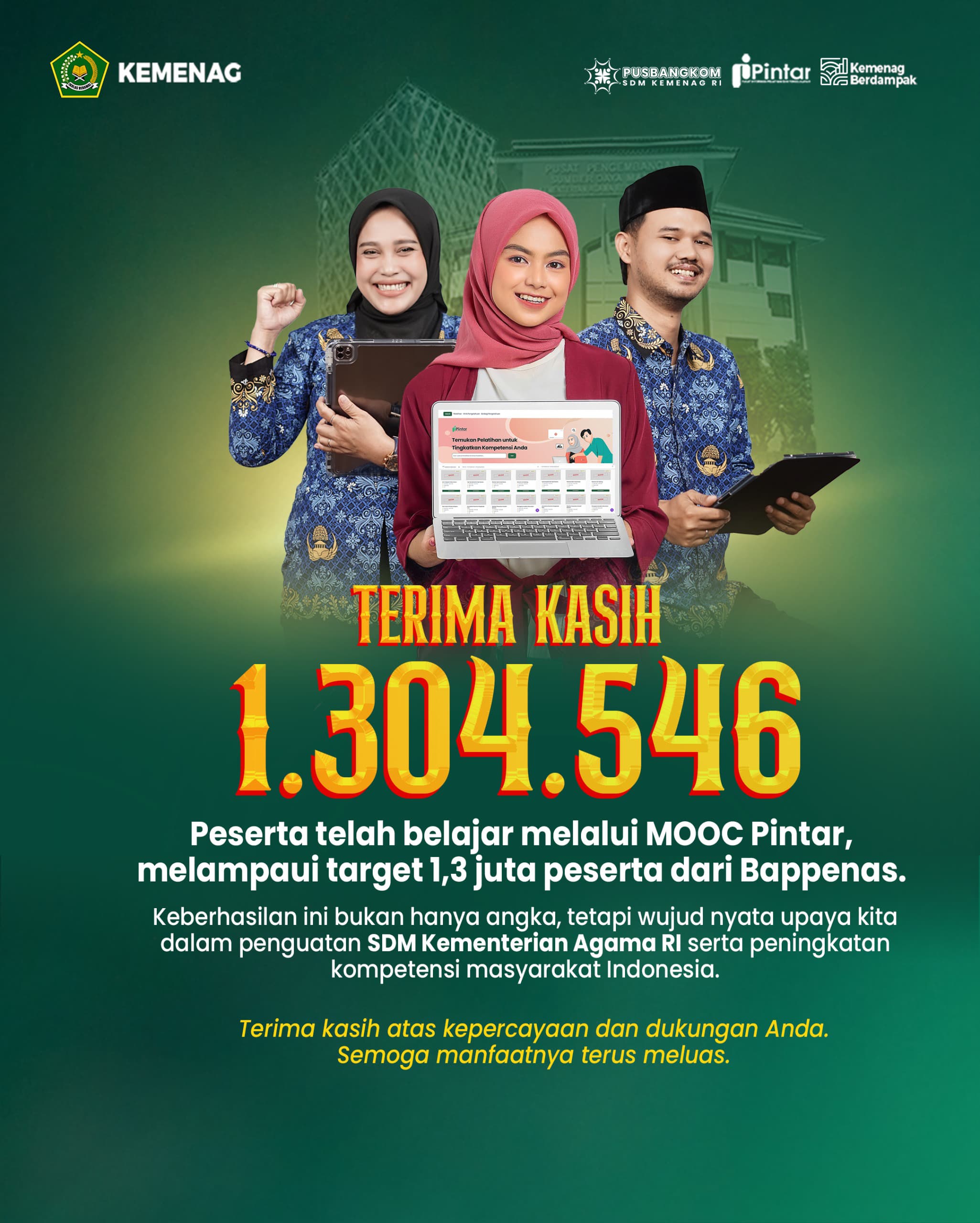 Kepala Pusbangkom SDM PK, Mastuki, mengapresiasi keberhasilan ini sebagai hasil kolaborasi dan komitmen bersama. “Melampaui target 1,3 juta peserta bukan hanya kebanggaan, tetapi juga amanah yang harus terus kami perkuat. Ini membuktikan bahwa pembelajaran berbasis digital di Kementerian Agama semakin dipercaya dan dibutuhkan oleh masyarakat," katanya di Pusbangkom SDM PK, Ciputat, Tangerang Selatan, Minggu (16/11/2025).