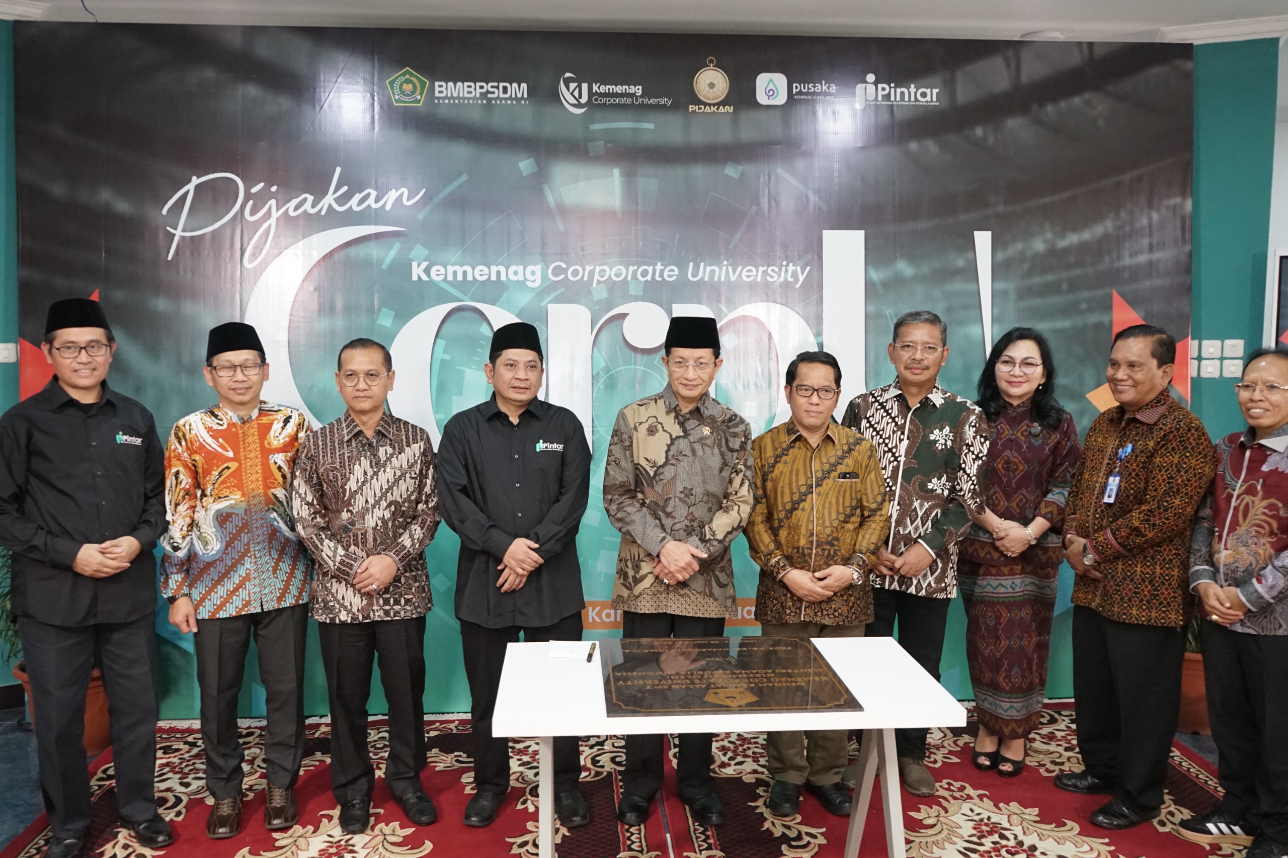 Ciputat (BMBPSDM)---Menteri Agama Republik Indonesia Prof. Nasaruddin Umar resmi meluncurkan Pusat Informasi Strategi Kebijakan Keagamaan (Pijakan) dan Corporate University (CorpU) Badan Moderasi Beragama dan Pengembangan Sumber Daya Manusia (BMBPSDM) hari ini di Kampus Pusbangkom Kemenag, Ciputat.